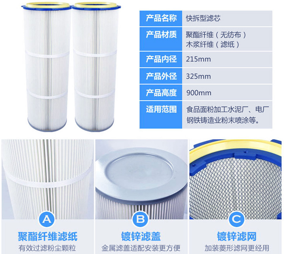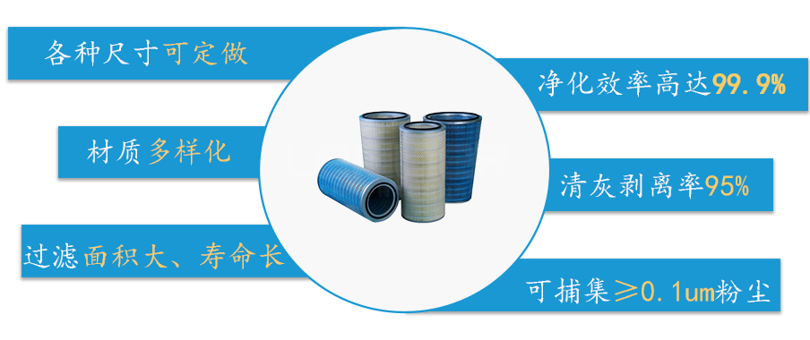 新鄉(xiāng)市利菲爾特濾器股份有限公司專業(yè)生產(chǎn)文氏里管法蘭式濾筒,空氣除塵濾筒由長度挺括的濾料折疊成褶, 尾粘合而成的星形過濾筒。濾筒無籠骨,安裝簡便。空氣除塵濾筒的品種較多,有細而長與粗而短之分。細長濾筒(如Φ≤160,L=1~2m),其褶(如45褶)間空隙大、夾角大,褶少而淺,過濾面積比同徑同長的濾袋大2~5倍,清灰易而效果好;適用于濃度≥15g/m粉塵的過濾除塵,過濾風速0.6~1.2m/min。粗短濾筒(如Φ350,L=0.66m)直徑大、長度短、褶多(120~350褶)而深、褶間空隙小,過濾面積大,較之同徑同長濾袋面積大14~35倍,適于場地面積小、空間小的地方布置;但因褶角小,粉塵易積聚,難于清灰,適于濃度≤5g/m粉塵的過濾除塵,過濾風速不宜>0.6m/min。空氣除塵濾筒是由 長度挺括的濾料折疊成褶, 尾粘合而成的星形過濾筒。濾筒無籠骨,安裝簡便。濾筒的品種較多,有細而長與粗而短之分;細長濾筒(如Φ≤160,L=1~2m),其褶(如45褶)間空隙大、夾角大,褶少而淺,過濾面積比同徑同長的濾袋大2~5倍,清灰易而效果好;適用于濃度≥15g/m粉塵的過濾除塵,過濾風速0.6~1.2m/min。粗短濾筒(如Φ350,L=0.66m)直徑大、長度短、褶多(120~350褶)而深、褶間空隙小,過濾面積大,較之同徑同長濾袋面積大14~35倍,適于場地面積小、空間小的地方布置;但因褶角小,粉塵易積聚,難于清灰,適于濃度≤5g/m粉塵的過濾除塵,過濾風速不宜>0.6m/min。