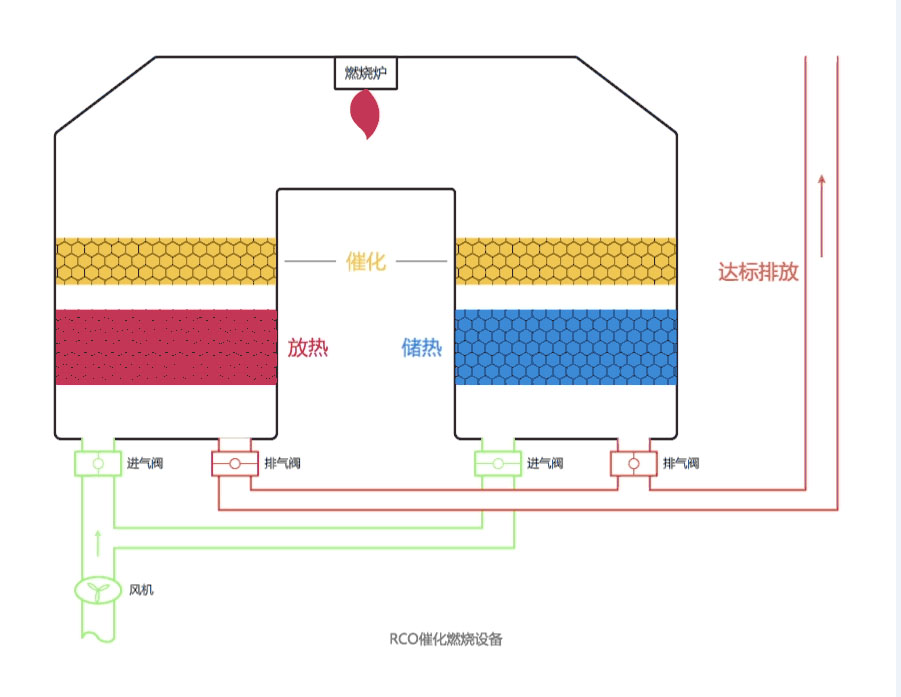 催化燃燒設備工作原理,在工業生產過程中,排放的有機尾氣通過引風機進入設備的旋轉閥,通過選轉閥將進口氣體和出口氣體完全分開。氣體首先通過陶瓷材料填充層(底層)預熱后發生熱量的儲備和熱交換,其溫度幾乎達到催化層(中層)進行催化氧化所設定的溫度,這時其中部分污染物氧化分解;廢氣繼續通過加熱區(上層,可采用電加熱方式或天然氣加熱方式)升溫,并維持在設定溫度;其再進入催化層完成催化氧化反應,即反應生成CO2和H2O,并釋放大量的熱量,以達到預期的處理效果。