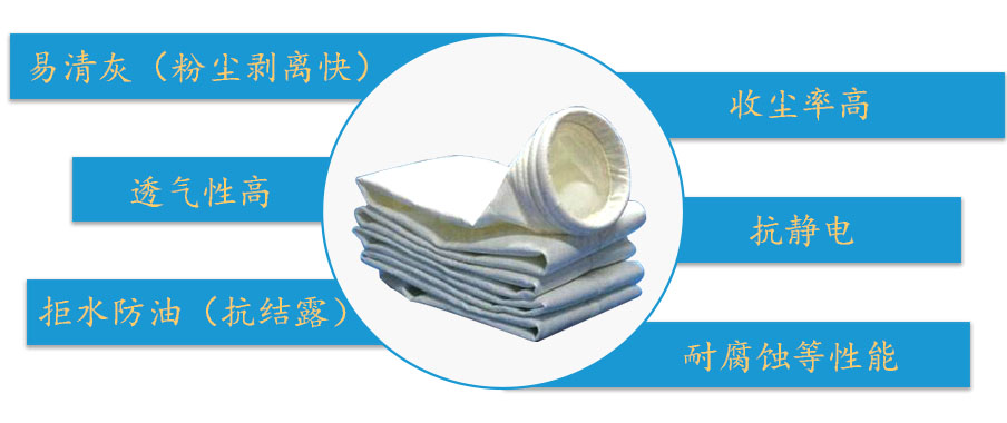 濾袋采用玻纖基布和化學(xué)纖維混合針刺而成。產(chǎn)品具有耐磨性能好、抗拉強(qiáng)度高。正常使用溫度150℃,短時(shí)180℃。適用于溫度適宜、煙塵濃度高、過(guò)濾要求高的煙塵過(guò)濾行業(yè)。1、表面未完濾效率高:通常工業(yè)用濾材是深層過(guò)濾。它是依賴(lài)于在濾材表面先建立一次粉塵層而達(dá)到過(guò)濾。建立過(guò)濾時(shí)間長(zhǎng),阻力大,效率低,截留不 ,過(guò)濾和反吹壓力高,清灰頻繁,能耗較高,使用壽命不長(zhǎng),設(shè)備占地面積大。使用覆膜除塵濾袋濾料,粉塵不能透入濾料,是表面過(guò)濾,無(wú)論是粗,細(xì)粉塵,全部沉積在濾料表面,即靠膜本身孔徑截留被濾物,無(wú)初濾期,開(kāi)始就是過(guò)濾,近的時(shí)間處于過(guò)濾。