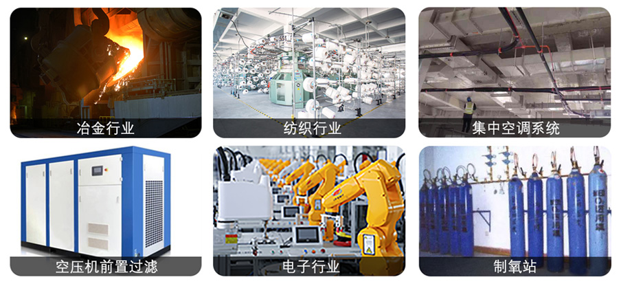 廣泛應(yīng)用于:冶金行業(yè),紡織行業(yè),空壓機(jī)前置過濾,電子行業(yè),集中空調(diào)系統(tǒng),制氧站